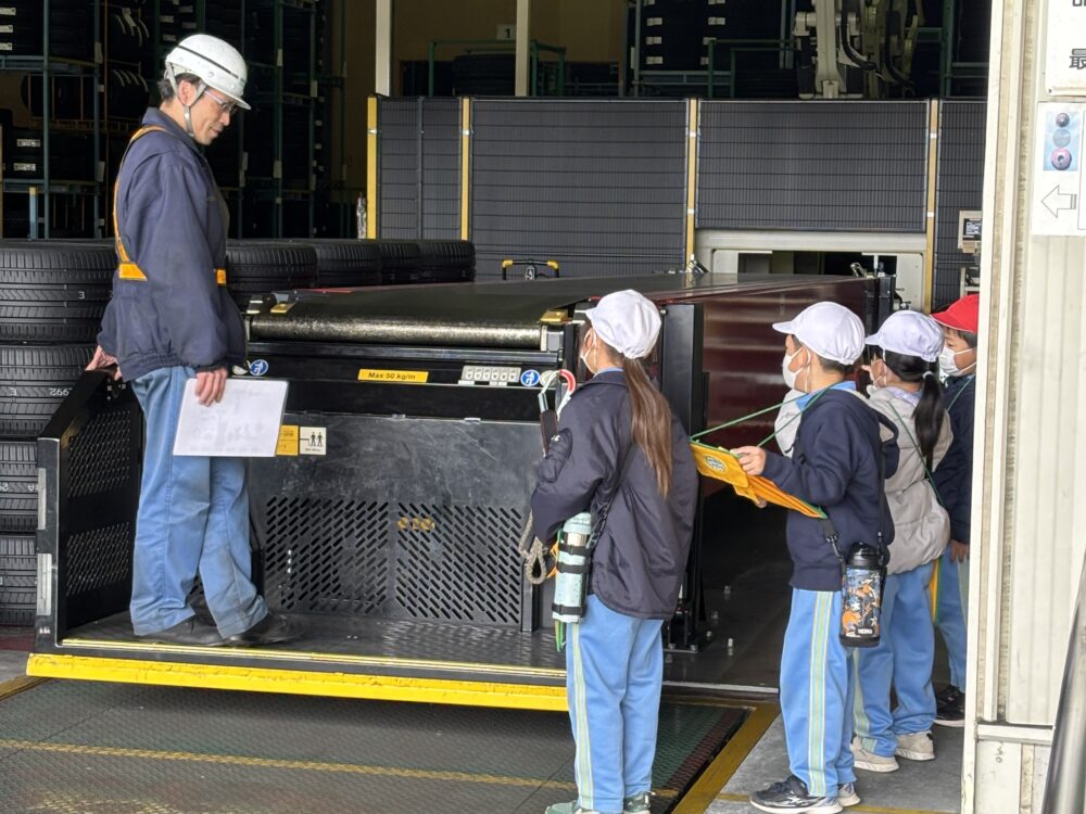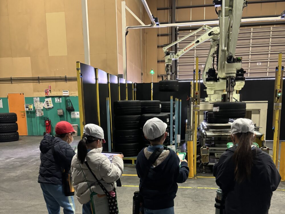 まず子どもたちは、タイヤを自動で搬送するロボットアームの動きを見学しました。ロボットがスムーズにタイヤをつかんで持ち上げる様子に驚きの声があがり、また、スタッフの説明にも真剣に耳を傾け興味を深めている様子でした。
